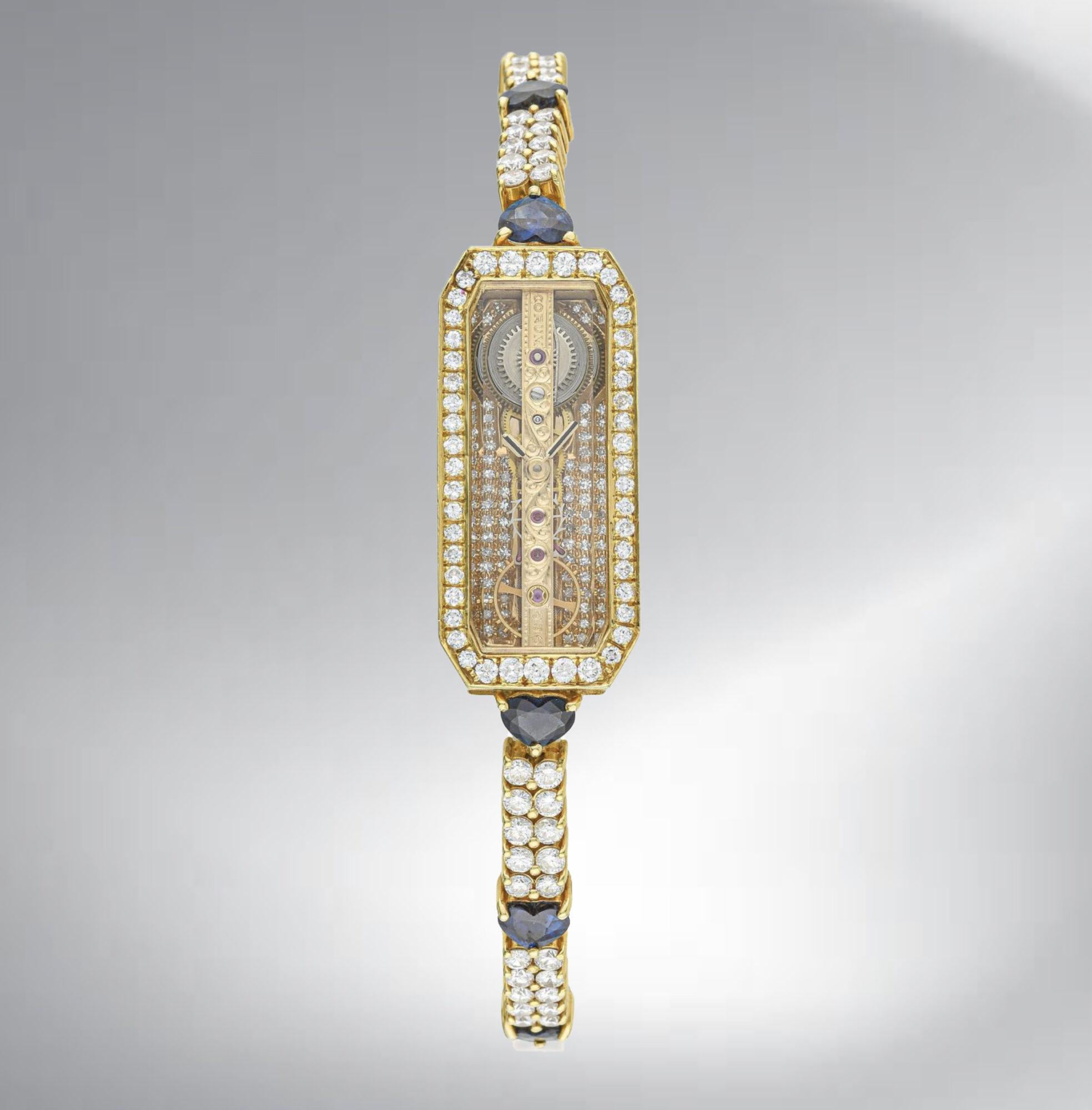 1980s Ladie’s Corum Golden Bridge watch in 18K Yellow Gold w/Diamonds & Sapphires Ref.13104