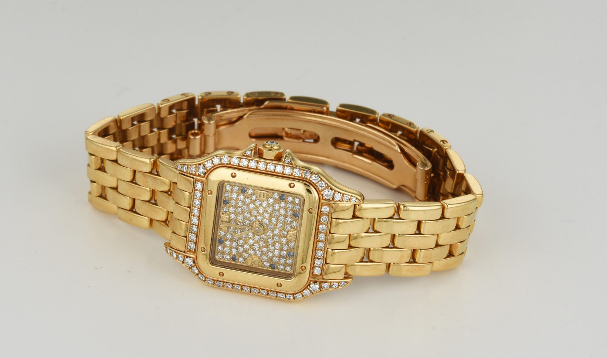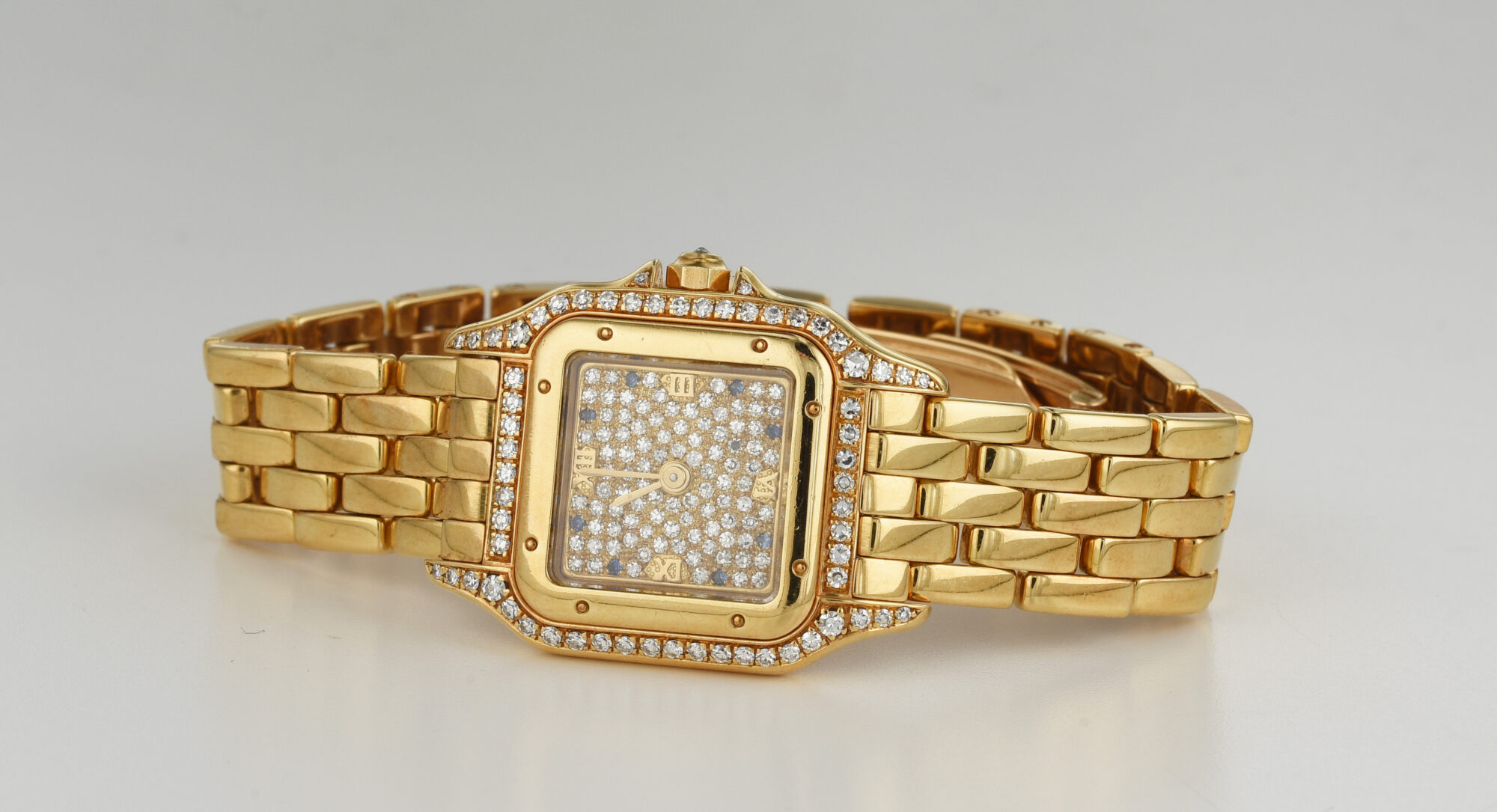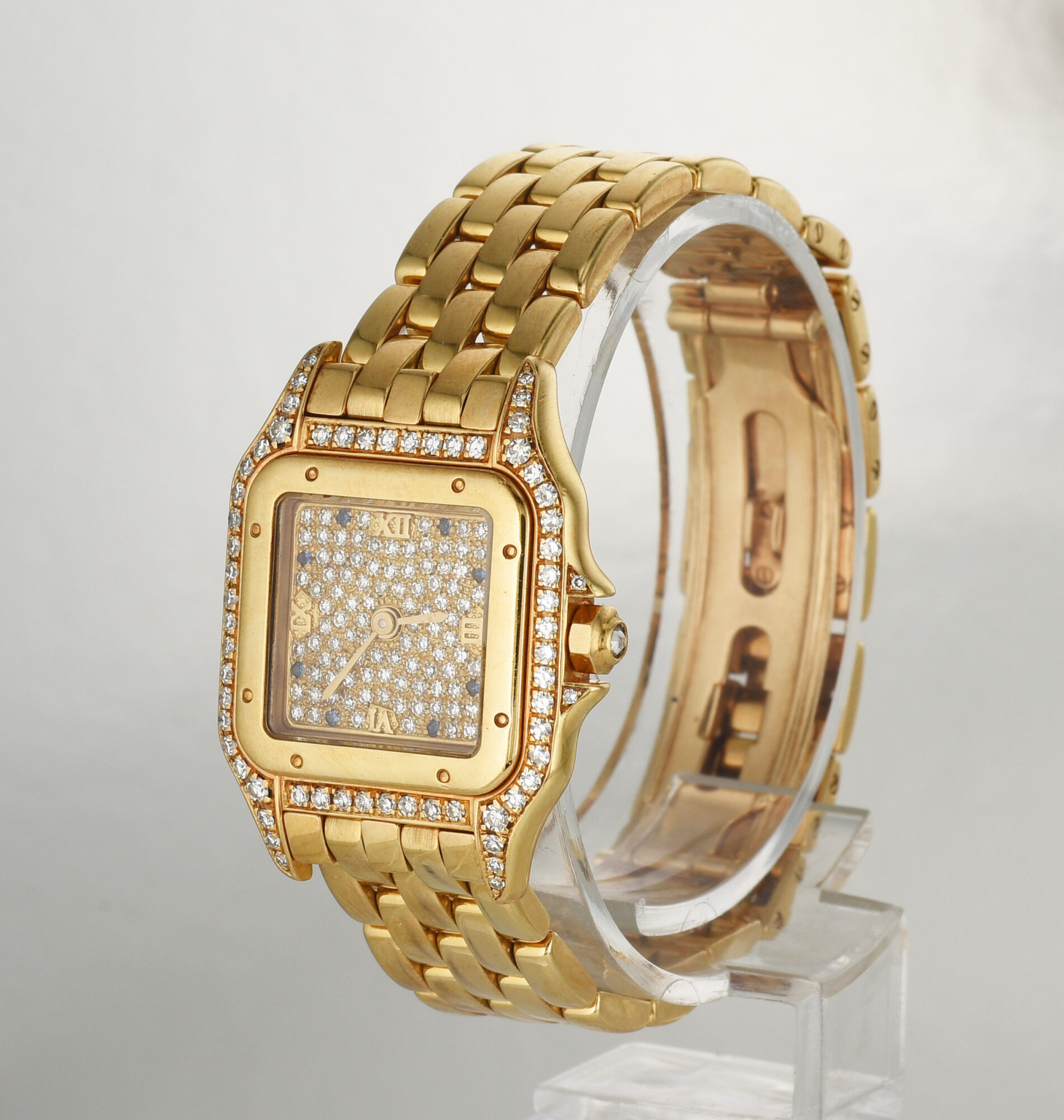 Dial: custom Diamond & Sapphire dial with Gold color Roman numbers and hands