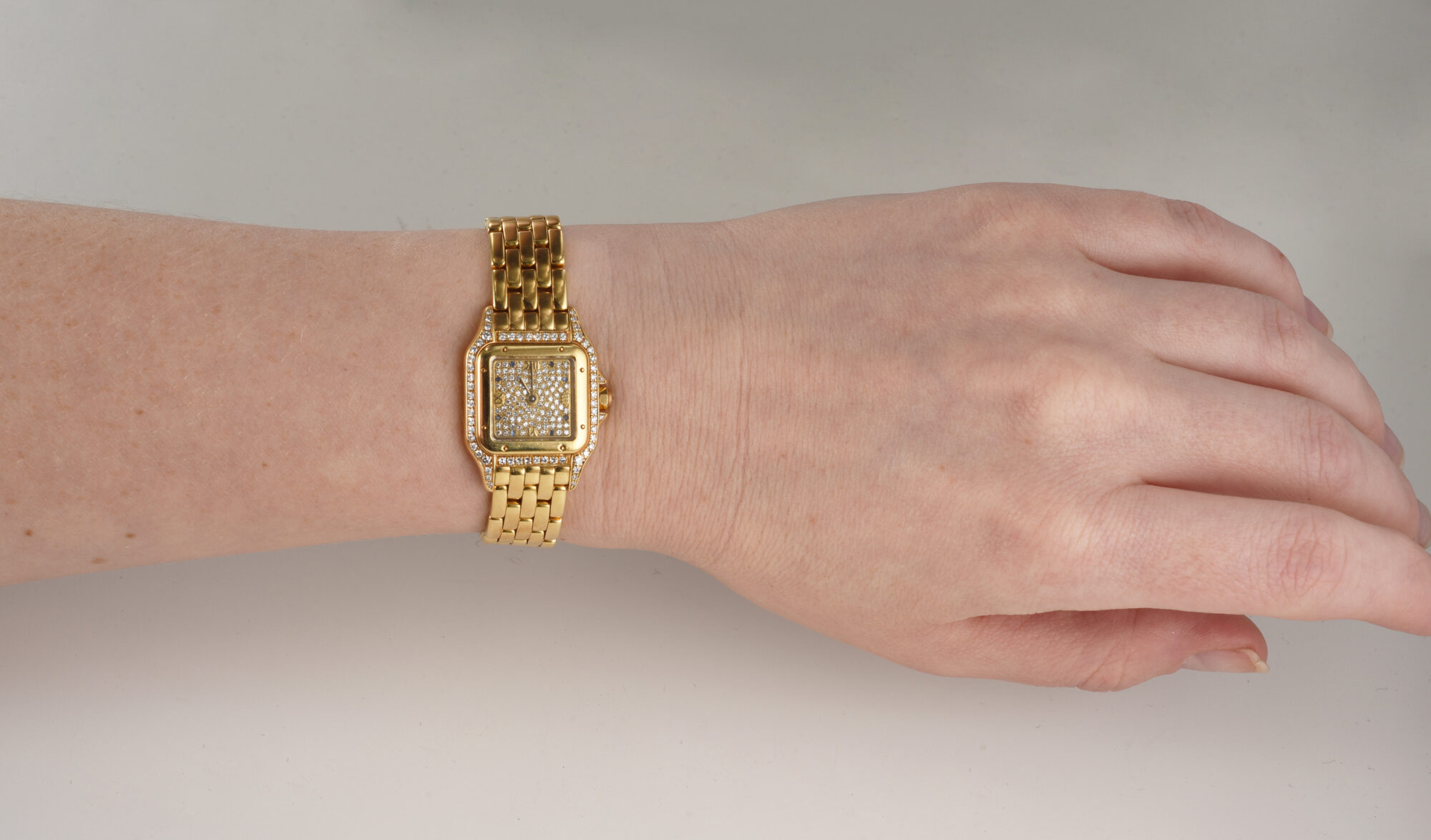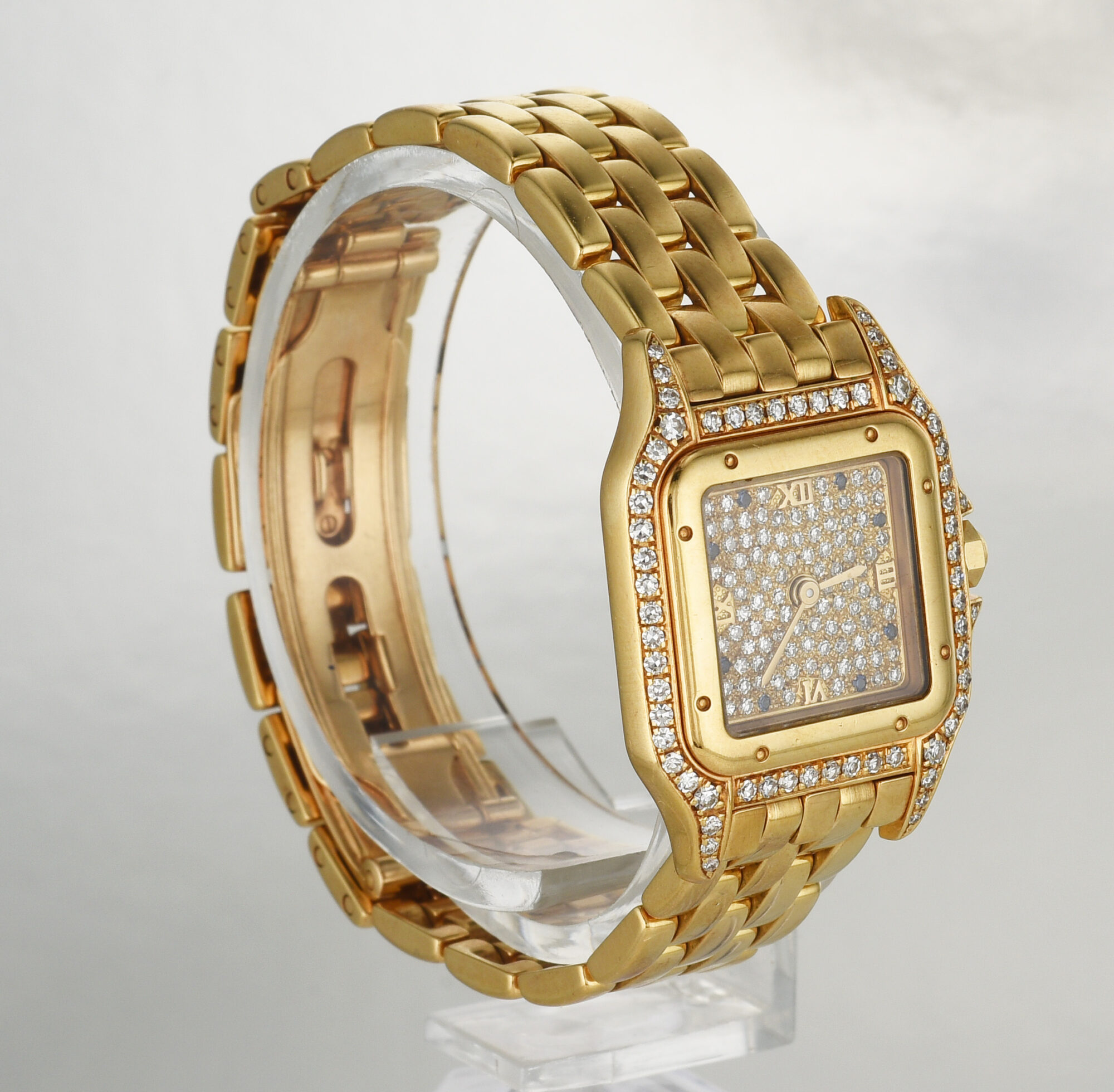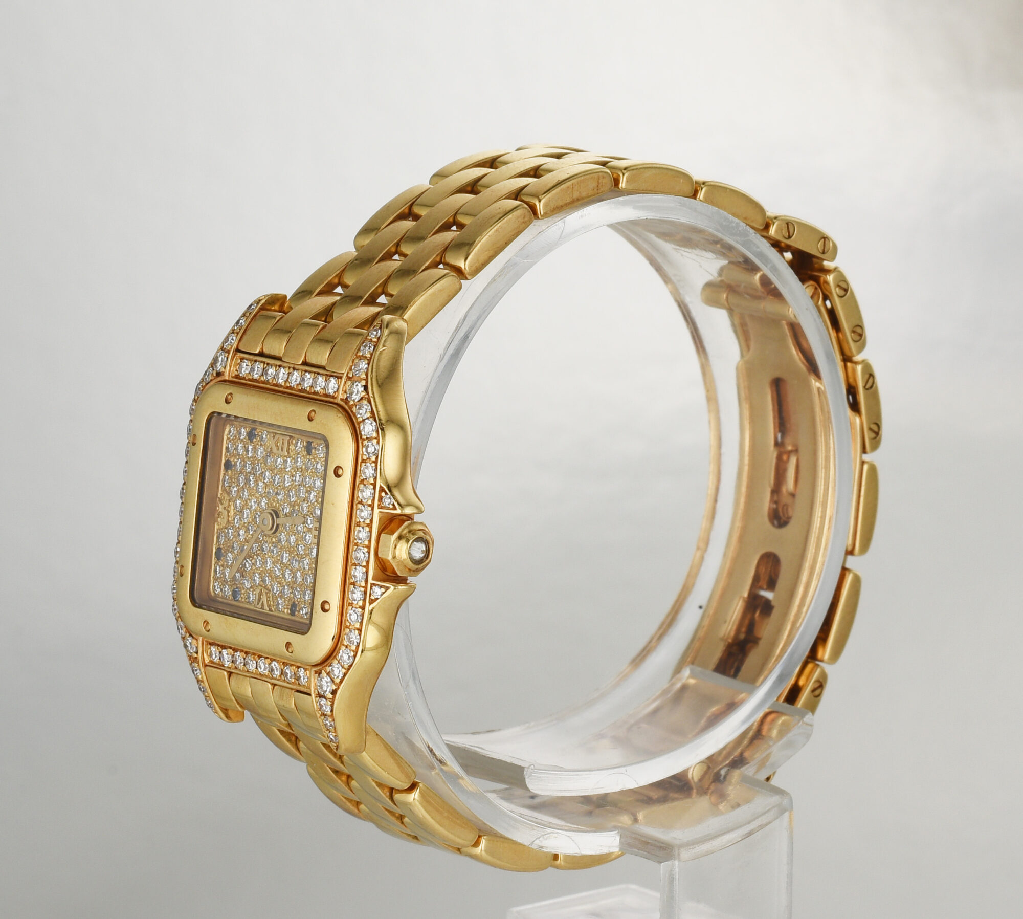 Dial: custom Diamond & Sapphire dial with Gold color Roman numbers and hands